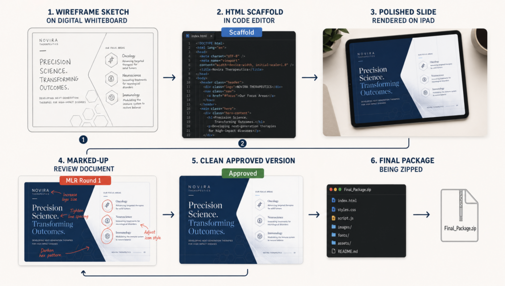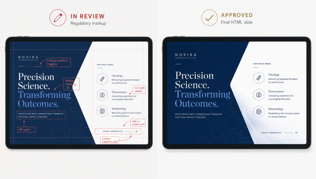 This is where pharma-naive agencies lose time. Building a slide is 20% of the job. Managing it through review is the other 80%.