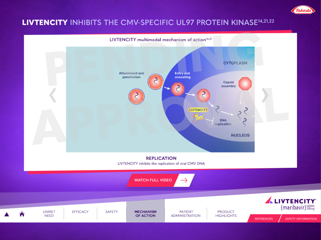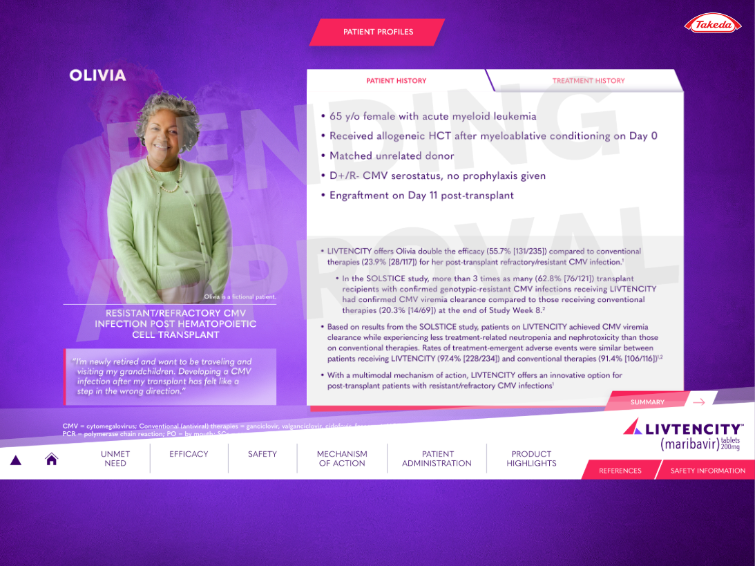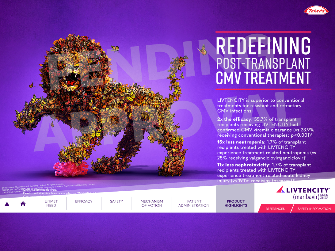 LIVTENCITY is indicated for post-transplant cytomegalovirus (CMV) infection and disease in adults and pediatric patients 12 years of age and older weighing at least 35 kg. The transplant population is a defined, high-stakes cohort — the reps presenting to this audience needed a sales tool that held up to the clinical conversation.