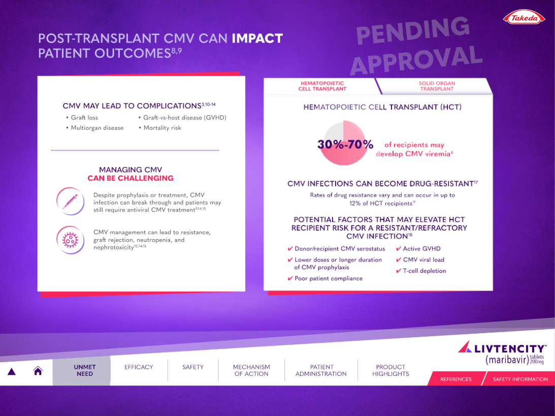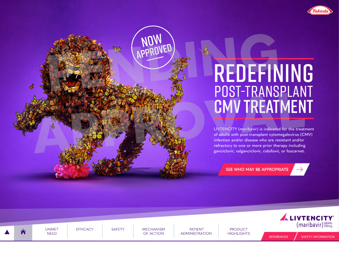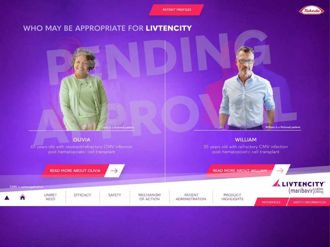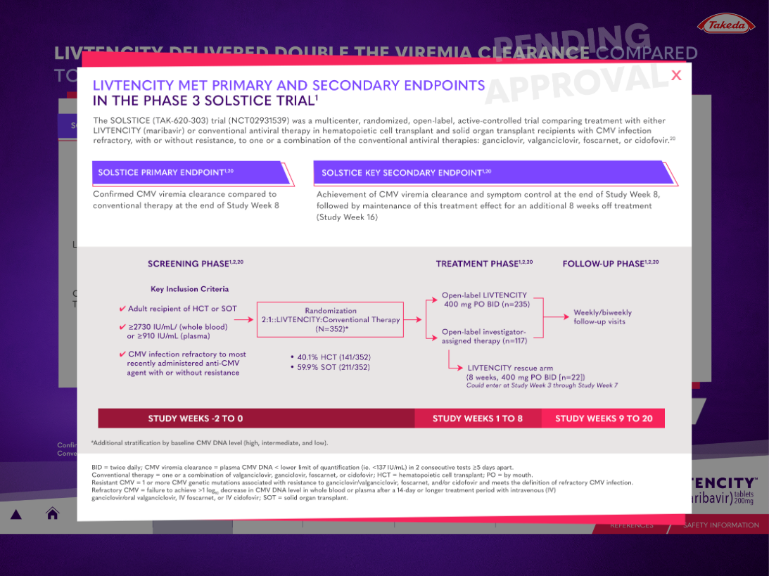LIVTENCITY is indicated for post-transplant cytomegalovirus (CMV) infection and disease in adults and pediatric patients 12 years of age and older weighing at least 35 kg. The transplant population is a defined, high-stakes cohort — the reps presenting to this audience needed a sales tool that held up to the clinical conversation.